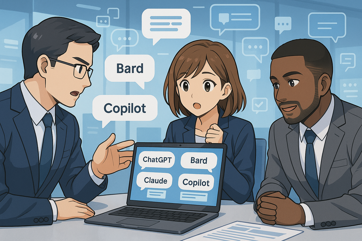 AIツールを前に議論するビジネスパーソンたち